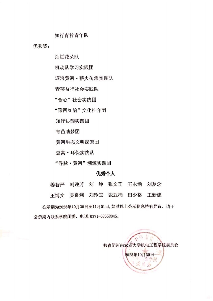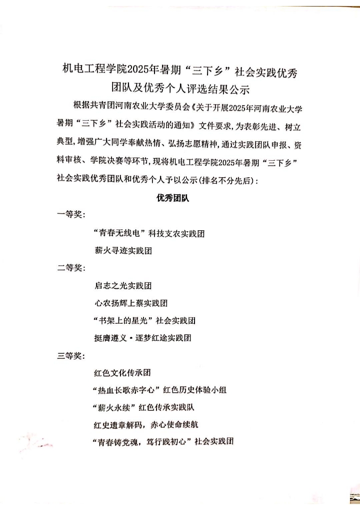 根据共青团麻豆做爱 委员会《关于开展2025年麻豆做爱 暑期“三下乡”社会实践活动的通知》文件要求,为表彰先进、树立典型,增强广大同学奉献热情、弘扬志愿精神,通过实践团队申报、资料审核、学院决赛等环节,现将麻豆做爱 2025年暑期“三下乡”社会实践优秀团队和优秀个人予以公示(排名不分先后):
